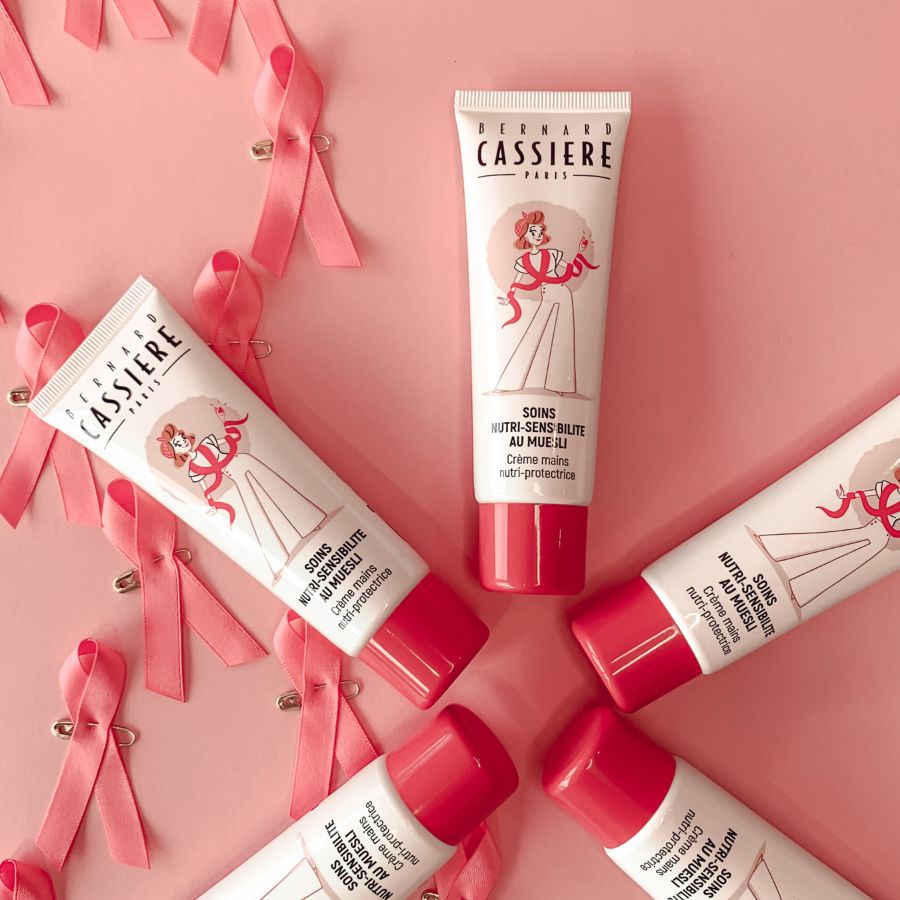 In this month of October, we present to you a new limited edition of our Muesli Nutri-Sensitivity hand cream, with the sole purpose of gathering even more funds to provide socio-aesthetic cares, finance the work of a young researcher for a day, or contribute to funding a breast prosthesis. There is so much to do to support those bravely facing this illness, with the first and most important step, of course, being to surround them with love and all our support. Undoubtedly, this is the idea that the talented illustrator Charline Fabry, also known as Mad’moiselle C*, wanted to express. She envisioned the design of our limited edition hand cream, even adorning its cap with a lovely pink color. Thanks to her skill, the tube of this universal treatment is adorned with a design that honors a young woman wearing a scarf around her neck, reminiscent of the famous pink ribbon, and holding her heart in her hand.